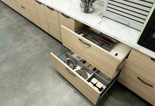 A balance between nature-inspired colors and modern accents creates a refreshing color scheme. To add a touch of modernity and sophistication, black geometric patterns have been incorporated into the design, contrasting with the green and white backdrop, making them stand out and draw attention to the sleek and contemporary kitchen structure. The starting price displayed for this kitchen includes only the wooden components and accessories