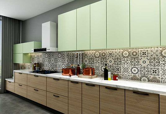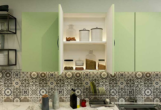 A balance between nature-inspired colors and modern accents creates a refreshing color scheme. To add a touch of modernity and sophistication, black geometric patterns have been incorporated into the design, contrasting with the green and white backdrop, making them stand out and draw attention to the sleek and contemporary kitchen structure. The starting price displayed for this kitchen includes only the wooden components and accessories