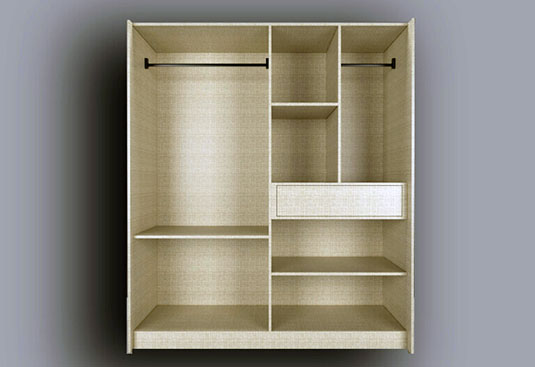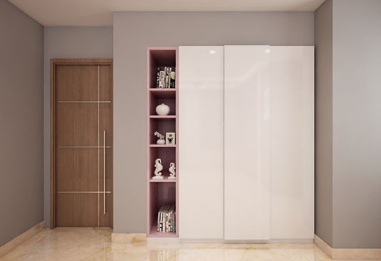 This versatile sliding wardrobe with charming UV high gloss shutter and flush handle is creating a minimalist yet stylish look. The open shelves at one end provides ample space to showcase decorative pieces or essentials for easy access. The starting price displayed for this kitchen includes only the wooden components and accessories.